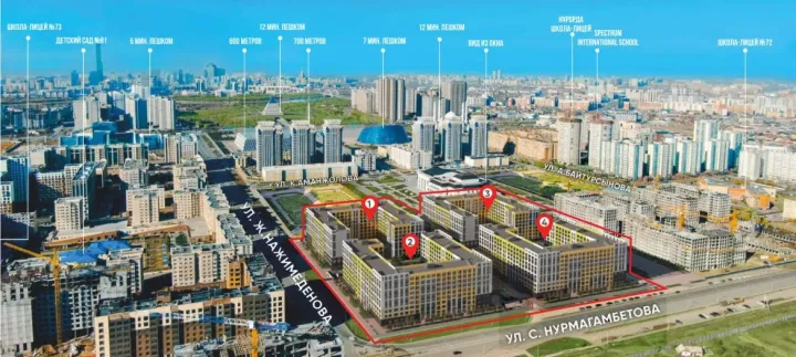 Многоквартирный жилой комплекс со встроенными помещениями и паркингами, административные здания с паркингами, офисное здания с паркингом, Дом быта и Медицинский центр город Астана, район Алматы, район пересечения улиц Ж.Нажимитдинова, К. Азербаева. Предварительная сертификация.